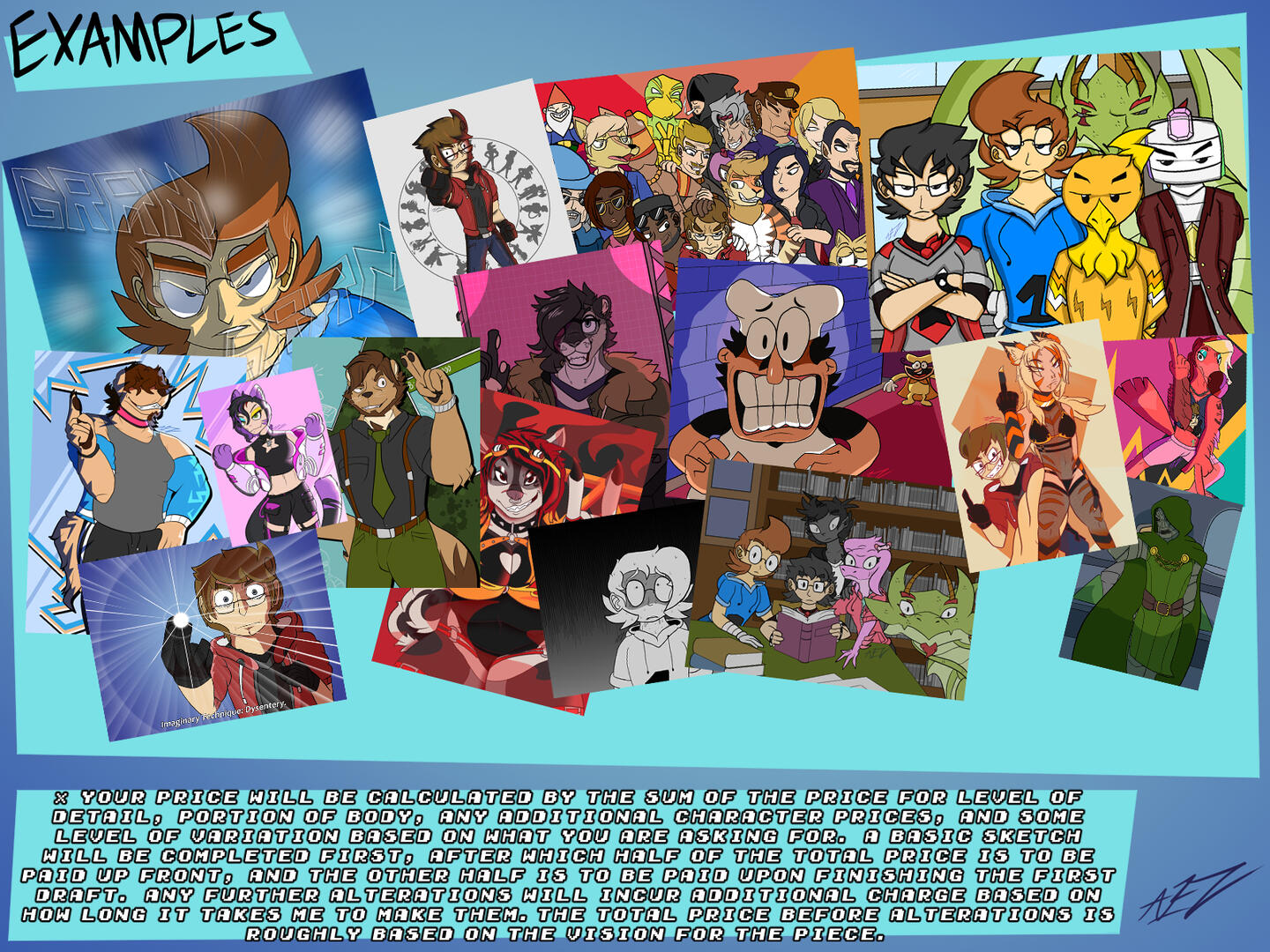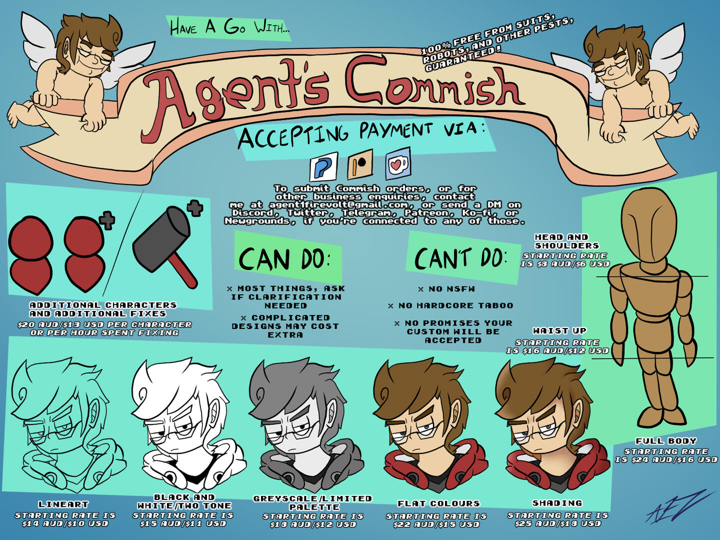 Here you will find the information for my commissions, or as they're officially titled, Agent's Commish. Be aware that some aspects, such as my rates, availability, and offered services may be subject to change whenever I feel they need it. For the most part, however, what you see in this infographic should hold true.